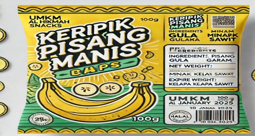 Berikut adalah contoh sederhana label produk untuk makanan ringan "Keripik Pisang Manis":